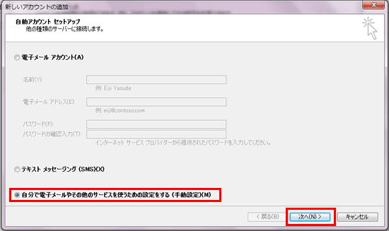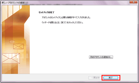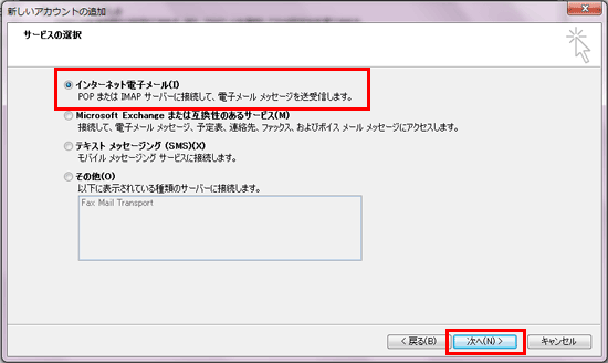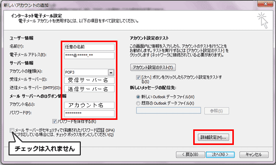 ![]() ※アカウント設定のテストは省略しても問題ありません。 省略する場合は、手順7.にて「[次へ]ボタンをクリックしたら、アカウント設定をテストする(S)」のチェックを外してください。 |