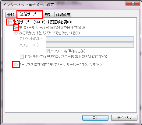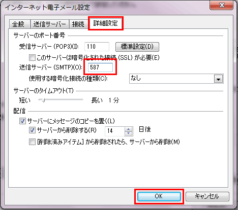 ![]() 「送信サーバー(SMTP)」の番号は初期設定では「25」になっています。「587」へ設定してください |