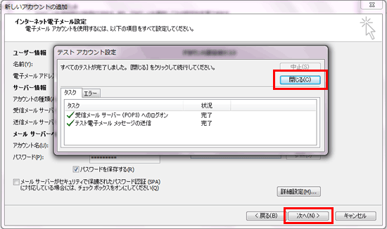 | インターネット電子メール設定画面で「次へ」をクリックすると、自動的にテストが行われます。 完了したら「閉じる」をクリックします。 |