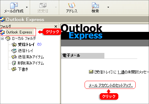 | 「スタートメニュー」→「プログラム」から「Outlook Express」を選択します。初めて起動するとダイアログが表示されるので「はい(Y)」をクリックします。メール設定の画面がでたら、次へ進みます。 メール設定の画面が表示されない場合は、左のメニューの「Outlook Express」をクリックしてトップの画面を呼び出し、真ん中の「メールアカウントのセットアップ」をクリックしてください。 |