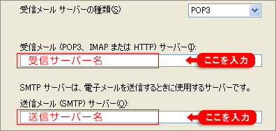 | 受信サーバ(POP)送信サーバ(SMTP)ともにメール一覧表に記載があるサーバ名を入力してください。 |