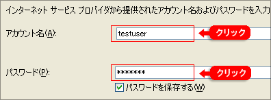 | 「アカウント」画面内に表示されている設定を行いたいメールアドレス ( testuser@example.awk.jpこのメールアドレスはスパムボットから保護されています。観覧するにはJavaScriptを有効にして下さい )をクリックします。 |