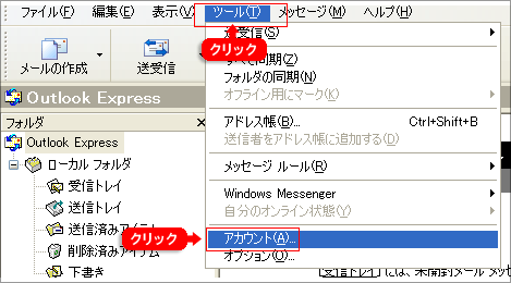 【参考: SMTP 認証】 SMTP認証は、メール送信の際にSMTPサーバとユーザとの間でユーザアカウントとパスワードの認証を行い、認証された場合のみメールの送信を許可します。これによりメール送信の安全性を確保します。 Outlook Express画面内にある、「ツール(T)」タブをクリックし「アカウント(A)」を選択します。 |