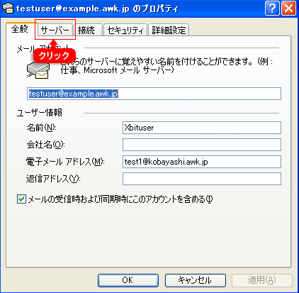 | 「全般」タブ画面が表示されましたら、画面内にある「サーバ」タブをクリックします。 |