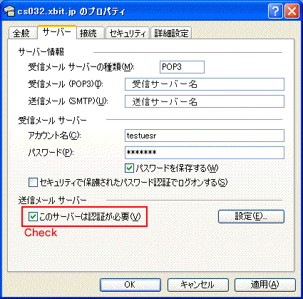 | 「サーバ」タブ画面内に表示されている「このサーバには認証が必要」ボタンにチェックを入れ、「OK」ボタンをクリックします。 |