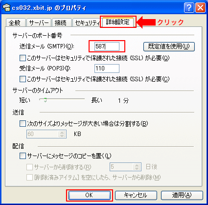 | 送信ポート番号は、「587」を利用します。 詳細をクリックして、ポート番号を「587」に変更の後最後にOKをクリックします。 |