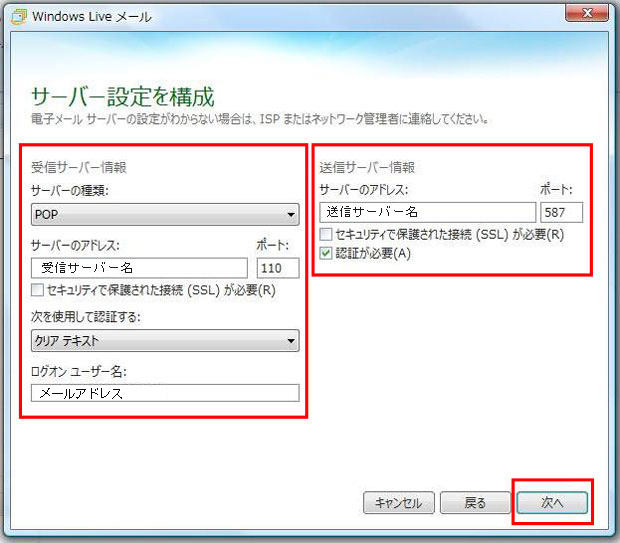 5.「サーバー設定」の各項目を入力し「次へ」をクリックします
